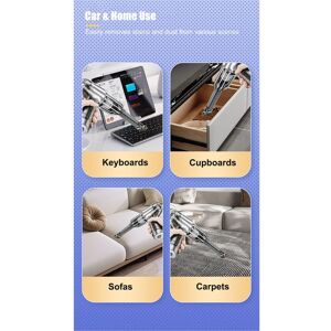 Multifunctional Cordless Vacuum Cleaner: The portable car vacuum cleaner with 5 different suction nozzles. On the other side, there is an air blower that effectively removes dust from camera lenses and pianos. When a nozzle is attached, the front can also be used as a vacuum pump to deflate storage bags. Similarly, when equipped with a nozzle, the back side can be used as a hand pump to inflate life jackets and buoys. 12000PA Strong Suction Power & Low Noise: The vacuum cleaner is equipped with a 120W powerful motor. Easily solve the cleaning challenges you face. The handheld car vacuum cleaner also features advanced noise reduction technology, the noise is less than 70 decibels, it offers a convenient and adaptable cleaning solution to meet all your cleaning requirements. Charging: Equipped with a built-in 2 x 7.4V 2000mAh lithium-ion battery, this handheld vacuum cleaner provides extended power for extended cleaning sessions. The cordless handheld vacuum cleaner can be easily