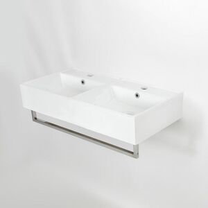 Create a contemporary look in your bathroom whilst adding a touch of style with the wall hung Milano Elswick 820mm rectangular double basin and towel rail. Offering ample wash space for two people to wash side by side and fitted with a single tap-hole per basin for use with mono basin taps the basin is made from premium quality ceramic with an easy to clean glaze. Accentuating the modern design is the stainless steel towel rail which is finishing in eye-catching chrome and stylishly hangs below the basin to keep your towel close at hand ready for use. - Ceramic construction with hard-wearing white coating - Towel rail is made from stainless steel with chrome finish - Modern wall hung design to create a contemporary look - Single tap-hole per basin for use with mono basin taps - Overflow in each basin for use with slotted wastes - Certified to EN14688 to ensure quality - This product is covered for 10 years - Dimensions: 820mm x 420mm x 150mm Please note: You will need mono basin taps