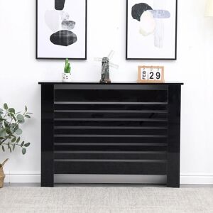 Size: 151.5(L)X19(W)X85(H)cm Internal Dimensions:L146.5XW16.5XH80cm Color: high gloss black Description: These elegant radiator covers feature a sleek high gloss black finish and a modern vertical slat design. The durable construction is made from particle board topped with a scratch-resistant UV laminate panel. Home assembly with flat pack furniture design. All hardware and instructions included Elevate your room decor while disguising outdated radiators with these contemporary black radiator covers. The smooth high gloss finish adds a touch of modern style to any space. Protect little fingers from hot radiators and prevent furniture damage with this essential home accessory.