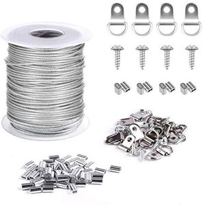 Specification: 30m picture hanging kit includes 15 pieces D-ring hangers with screws, 30 crimp tubes, 30 meters picture hanger. Compatible with hardware such as twist ties, crimp tubes, picture hooks, and D-rings. The smooth surface allows you to tie tight knots without puncturing your fingers. This roll of steel wire can be cut into different sizes to hang many picture frames, also can be used for hanging clothes and indoor and outdoor curtains etc. Color: silver Wire diameter suspension weight: 1.5 mm (Hold up to 25 kg) Suspension wire length: 30 m Package includes: 1 suspension wire of 30 meters 30 crimp tubes 15 x D-ring photo hangers 15 x screws Note: Please hang the correct weight according to the size of the hanging wire Due to the manual cutting, there may be thread length errors