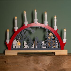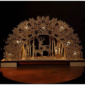 Brighten up your home this Christmas time with this beautiful Battery Operated Wooden Reindeer Candle Bridge Christmas Decoration. This stylish piece will bring the festive spirit to all your friends and family when they come to visit. Depicting reindeer in a festive scene with a shooting star, the decoration will look great as part of a festive display or stand out alone. Ideal for anywhere around your home whether you choose to place it on your mantle piece, windowsill or table top display. Features 10 Warm White LED lights which can be turned on/off by a switch underneath. Powered by 2 x AA batteries (not included) this decoration is suitable for indoor use only. Dimensions: H34cm x L45cm x W5cm.