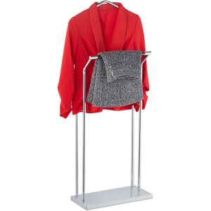 Are you on the look-out for an elegant way to keep your clothes wrinkle free? Then look no further than this valet stand! The stylish stand with wide hanger can be used to hang up coats, jackets, shirts and more. Trousers, skirts, ties and scarves can also be placed over the straight rail. Place the clothing hanger rack in the bedroom, dressing room or hallway and keep everything tidy. The elegant mix of metal and wood looks great anywhere. Clothes Valet in Detail - Size H x W x D: approx. 110 x 46 x 19 cm - Trouser rail H x W: approx. 80 x 38 cm - Shirt hanger H x W: approx. 108 x 46 cm - Load capacity: approx. 10 kg - Weight: approx. 4.1 kg - Material: Chromed metal, walnut wood - Colour: Silver, brown Suit Stand for a Crease-Free Wardrobe - With 2 rails for hanging clothes - For suits, trousers, ties, scarves etc. - Elegant and modern design with mix of materials - Stable thanks to the heavy base - Free-standing - Ideal for hallways, bedrooms or closets Included in Delivery - 1x