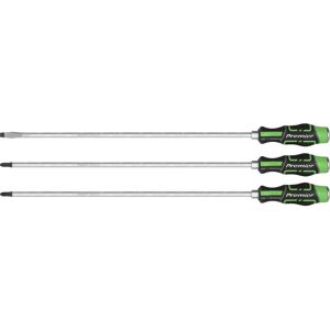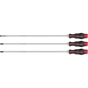 Hardened and tempered Chrome Vanadium extra-long steel shafts with a satin polished finish. Feature hexagonal bolsters for use with a wrench. Contoured, textured handles with hammer caps. Shot blasted and blackened tips. Features & Benefits: • Hardened and tempered Chrome Vanadium extra-long steel shafts with a satin polished finish. • Feature hexagonal bolsters for use with a wrench. • Contoured, textured handles with hammer caps. • Shot blasted and blackened tips. • Contents: Slotted; 8 x 450mm, Phillips; #2 x 450, #3 x 450mm. • Lifetime guarantee*. • Model No. AK4935 Specifications: Model No AK4935 Brand: Premier Contents: Slotted; 8 x 450mm, Phillips; #2 x 450, #3 x 450mm Nett Weight: 0.81kg