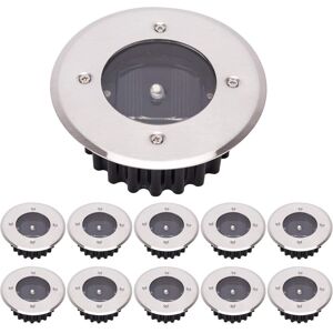 Set of 10 high-quality LED solar spotlights. Material: Stainless steel tempered glass; Dimensions: about 8.5 * 3.5 cm; The lifespan is 100,000 hours. Round solar light using the sun's energy. During the day, the batteries are charged by solar energy and at night, the in-ground lights turn on automatically thanks to the day/night sensor. No electricity costs and tangled wires, easy installation. Attractive lighting for your driveway or garden/patio. Stainless steel and hard glass surface, strong pressure resistance. Protection class: IP 65 - Complete protection against contact, protection against dust ingress, Protection against water ingress when submerged. Perfect for gardens, patios, paths, sand, and concrete. Technical Specifications: 1. Product Type: In-ground Spotlight 2. Waterproof: IP65 3. Light Color: Cool White 4. Bulb: 1 LED 5. Battery: 1 x 1.2V 60mAH NI-MH 6. Charging Time: 5-8 Hours 7. Working Time: Fully charged can illuminate 6-8 hours NOTE: 1. The product has no