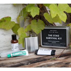 IWOOT - Stuff you really, really wantThe Stag Survival Kit from award-winning British design house Men's Society has been specially created to supply a groom-to-be with an emergency kit to help him walk safely down the aisle the morning after the night before. It won't necessarily help if he wakes up in a police cell or tied to a lamp post, but it should see him through most eventualities.Housed in a sleek metal tin, the kit includes a pocket hip flask to keep 'sustained' through the night. An eye mask will help him sleep if he doesn't pass out, while a dog tag rescue necklace will remind him of where he needs to be. A 2-in-1 shampoo and body cleanser, made with hand blended natural ingredients and a toothbrush and toothpaste will ensure he smells sweet the morning after.Contains: 50ml Shampoo and Body Wash, Toothpaste, Toothbrush, Dog Tag Rescue Necklace, Pocket Hip Flask, Eye MaskMade in BritainDimensions: H: 3.5cm x W: 14cm x D: 10cm