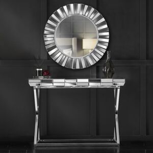 Knightsbridge Collection - Mirrored Console Table With Chrome Crossed Legs + Wall Round Mirror The exclusively designed Knightsbridge collection showcases this impeccable two-piece set made up of our mirrored console table and large round mirror. Both components boast the same unique mirrored 3D effect design in calming tones of silver and grey. Display your accessories on the sleek mirrored top of the beautiful console, it will be the perfect accent piece in your hallway, living or dining room or even your bedroom. Complete the look by adding the large round mirror to modernize your space and maximise light in your home. Registration Number 6066548 (MIRROR) Design Registration Number 6066542 (CONSOLE) Create a sensational style statement with this two-piece set featuring a striking console table and large round mirror all surrounded by a unique 3D effect design. Choose this unique duo in either grey and silver or rose gold and silver This impressive two-tone collection is sure to be