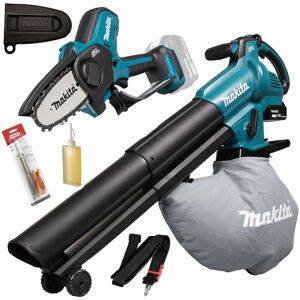 Makita Blower + Chainsaw Twin Pack includes the DUC101Z Cordless 18v Brushless Pruning Saw and DUB187Z 18V LXT Brushless Cordless Variable Speed Blower Vacuum Leaf Bag. This is a bare tool set - so no batteries or chargers are supplied Makita DUC101Z Chainsaw Pruner Makita DUC101Z Cordless 18v Brushless Pruning Saw is a highly efficient, lightweight, and compact tool for pruning garden tree's / bushes or orchard trees. Equipped with a direct drive brushless motor with an externally rotating rotor, this cordless pruning chainsaw ensures high operational efficiency. The brushless motor provides a maximum output power of 320W, making it a powerful and reliable pruning chainsaw for various the pruning, cutting of branches & other tasks. The compact structure and ergonomic handle make it easy to use the cordless pruning saw with one hand. Its improved protection against dust and moisture, with XPT (Extreme Protection Technology), ensures that pruning saw remains long-lasting and durable,