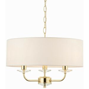 Specification Endon Nixon - 3 Light Multi Arm Ceiling Pendant Nickel Plate, White Silk Effect, E14 Finish: Nickel Plate, White Faux Silk Material: Crystal Glass, Fabric, Steel IP Rating: IP20 Height (cm): 79 Diameter (cm): 45 No. of Lights: 3 Lamp Type: E14 Bulb: Candle Dimmable: Yes Description The 3 light ceiling pendant is finished in a bright nickel plate. The 3 arms are complimented with a touch of crystal and the fitting is topped with a narrow, vintage white, faux silk shades. Height is adjustable, dimmable and suitable for use with LED lamps. Matching items available