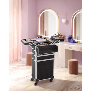 Specifications:Colour: Ink BlackMaterial: Aluminium Frame, MDF Medium Density Fibreboard , ABS PlasticProduct Size:Overall Size with Castors : 13.4"L x 9.4"W x 31.2"H 34 x 24 x 79.3 cm Overall Size without Castors : 13.4"L x 9.4"W x 28.3"H 34 x 24 x 71.9 cm Size of the Top Shelf 4x : 8.5"L x 6"W x 1.4"H 21.5 x 15.3 x 3.5 cm Height of the 1st Tier: 7.4"H 18.8 cm Height of the 2nd Tier: 3.5"H 8.8 cm Height of the 3rd Tier: 3.5"H 8.8 cm Height of the 4th Tier: 14"H 35.5 cm Product Weight: 15.4 lb 7 kg Max. Static Load Capacity: 33 lb 10 kg Package Contents:1 x Makeup Trolley4 x Castor2 x Key4 x DividerNotes:When unpacking, please note that the upper small carry-on suitcase is located in the lower large one.The makeup trolley may vary slightly less than 1 mm from our stated sizes due to manufacturing.Please note the sizes of this makeup trolley.There may be a slight odour when unpacking. Place this makeup case in a well-ventilated area to air it out.We recommend locking the suitcase when you move it, especially when using it on the go, to prevent the locks from opening and the items stored inside from falling out and getting damaged. Rebrilliant