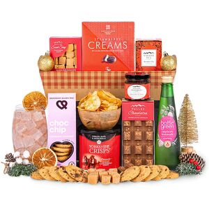 A truly delicious Christmas gift, perfect for treating someone who loves both sweet and savoury. Send your Christmas wishes with indulgent handmade chocolates, Yorkshire crisps and gorgeous cookies perfect for any recipient. Contains: Triple Chocolate Chip Cookies (G/F) Luxury Valley Breakfast Tea 20g Yorkshire Crisps Tomato Basil Mozzarella Crisps 50g Valley Strawberry Jam 130g Handmade Valley Chocolate Salted Caramel Chocolate Bar 90g Valley Sweets Handmade Clotted fudge Strawberry Fondant Creams Sparkling Presse Fruity Raspberry Lemonade 275ml Presentation Gift Hamper