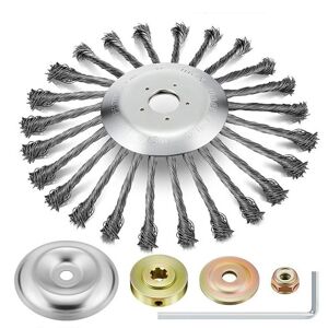 Upgraded Type: The 10 inch grass trimmer blade is upgraded to 24 twisted knotted wires and the length is longer than the normal ones on the market. High Quality: This wire brush cutter blade is made of high-grade steel wires and strengthens the steel plates to better hold the wires. Wide Applications: The trimmer brush head replacement kit can be used for various scenarios such as gardens, lawns, yards, parking lots, sidewalks, patios, etc. It works very well, especially for grass in corners or brick joints. It can also be used to remove corrosion, rust, paint, splashes, etc. Suitable for Most Trimmers: The 10-inch grass trimmer head steel wheel has a 1-inch hole in the middle to fit most straight shaft gasoline and electric trimmers on the market, such as , , , , etc. Easy to Use: This weeding attachment set is easy to install, just select the right adapters according to different weeding machines. The center hole of this weed brush blade is 1 inch to fit most grass trimmer machines.