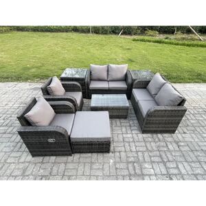 Set dimensions: 1 x Big Footstool size:65L x 65W x 34H cm; 1 x 3 Seater sofa with double armrest: 162L x 67W x 79H cm;Fully Assembled) 1 x 3 Seater sofa with single armrest: 157L x 67W x 79H cm; (Semi-Assembled) 1 x Fire Pit Table Dimension:140L x 80W x 70H (cm;) Dark grey mixed rattan with dark grey fabric .Color may vary due to light or monitor .we are unable to return the item due to this problem .the product is delivered on pallet,to kerbside only.