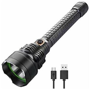 【Super Bright】This is a new generation of XHP9 chip, can provide higher brightness and excellent light. LEDs boast an extended 50000-hour lifespan and the maximum input is 90000 lumens. It's truly a searchlight, 20 times more brightness than basic incandescent lights, it can easily light up an entire room! 【5 Modes】With 5 modes setting (High / Average / Low / Strobe / SOS). Adjustable focus, suitable for different situations,Makes for a practical addition to any household or emergency kit, it ideal for walking around the house, dog walking or camping. 【USB Rechargeable & Power Display】With universal USB cable interface, more convenient for charging(with USB cable ); Intelligent battery indicator, charge at any time, better understand the power consumption status. The green light is always on when the battery is full, and the red light is flashing when the battery is low 【Waterproof and High Quality】IP65 Waterproof level protect it co.ukom splashing water co.ukom any angle. Made of
