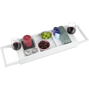 Make taking a bath even more comfortable. This extendible bathtub carry is spacious enough for all your utensils such as soap, sponge and shampoo. This way you can always find everything you need in reach and also use your phone or tablet safely protected from water. There is also a wine glass holder for that extra touch of luxury. The caddy is made of robust bamboo and thus idea for moist and damp environments. With its lovely white paint, it easily fits in any bathroom. Bathtub Caddy Details - H x W x D: app. 7 x 67.5 x 20.5 cm - Max. width: app. 101.5 cm - Weight: app. 1.3 kg - Material: Bamboo - Colour: White Handy Extendible Bathtub Tray - Adjustable to fit any tub - 3 Compartments for soap, sponge, phone etc. - With 2 round holders for razor and more - Keep necessities in reach while soaking - Eye-catcher for your bathtub Included in Delivery - 1 x Extendible Bathtub Tray - Decorative items shown in product photos are not included