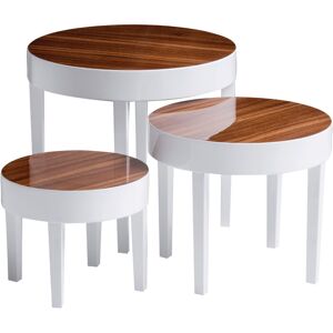 The nest of three round tables will make a stylish and practical addition in your home. The legs are made using durable, strong pinewood and are given a white high gloss finish that complements the pear wood effect top. Perfect for when you are needing extra surface space, the sturdy yet lightweight tables can easily be moved to where required. When not in use you simply place the smaller tables under the large one for a compact unit. The nest of three tables will make a great feature in your living area complementing most decors.