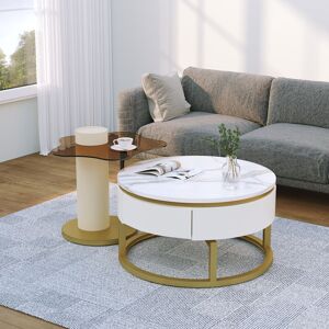 Nesting design: The two tables fit perfectly into each other and offer flexible usage options. Marble look: The upper table has a marble PVC surface that brings a touch of elegance to your home. Glass surface: The higher table has a glass top in a warm teal brown shade for a sophisticated look. Drawer and swivel mechanism: The top table has a practical drawer for storage and a swivel mechanism for added functionality. Height-adjustable foot pads: Both tables are equipped with height-adjustable foot pads to compensate for uneven floors. Our 2-piece nesting coffee table set is an elegant and space-saving solution for your home. With its versatile design and high-quality materials, it will become an eye-catcher in any room. Note: the two tables are not the same white colour Overall Dimension: 60*60*32 + 32*32*37cm (L*W*H) Package Dimension: 75*69.5*33.5cm (L*W*H) G.W./N.W.: 21/19KG Material: - The shorter tables have MDF + marbled PVC decals on the table tops and high-gloss lacquer on
