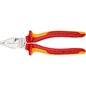 02 02 180 SB High Leverage Combination Pliers 35% less effort required than with conventional combination pliers. with cutting edges (hardness approx. 63 HRC) for heavy duty. Easier work due to optimised leverage. Easier cutting, powerful gripping, bending and pulling. Long cutting edges for thicker cables. With gripping zones for flat and round material, suitable for versatile use. Precise, minimal light gap between the gripping jaws to ensure optimal function of the cutting edges. Cutting edges additionally induction-hardened, cutting edge hardness approx. 63 HRC. With comfort handles: consisting of three ergonomic components for optimized handling and equipped with two KNIPEXtend interfaces for extensions. - Cutting capacities hard wire (diameter): Ø 2.5mm- Cutting capacities piano wire (diameter): Ø 2.0mm- Cutting capacity copper cable, multiple-stranded: Ø 11.5mm- Cutting capacity copper cable, multiple-stranded: 16.0mm²