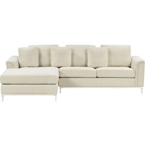 Right Hand Sitting Sectional Sofa with Ottoman. The elegant corner sofa comes in a set with a stylish ottoman. It features a modern design that complements any contemporary interior. The exceptionally long chaise, situated on the right from the perspective of the sitting person, offers ample room for relaxation. The ottoman may be arranged with the sofa creating additional seating space or can serve as a coffee table. All parts are made of polyester linen. Its stable, chrome-plated legs and add a touch of modern to the classic design. The additional cushions feature a removable cover that translates to easy cleaning without a worry for stains. Details: Product Type: Corner Sofa Style: Traditional General Color: Beige, Silver Shade: Light Beige Material Type: Fabric Main Material: Fabric Additional Material: Metal Filling Material: Foam Material Composition: 100% Polyester Shape: L-Shaped Arm Style: Track Orientation: Right Hand Pattern: Solid Seat Construction: Elastic Belt Seat Foam