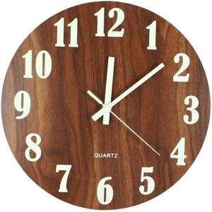 Easy to read:The large wooden decorative round wall clock has night light function for easily to see and read at night.Wooden MDF(dark brown)dial with white numbers for easily to read during the day. Non-ticking wall clock:Super-quality quartz sweep movement guarantees accurate time and absolutely silent environment. rustic country design.This clock no frame nor glass cover.Large decorative round wall clock measures 12 inches in diameter. Easy to hang:Back slot design offers easy installation,1 hook included.Powered by one AA battery(not included)please use normal carbon battery. Color:brown Material:wood Size:30cm Package Contents: 1*Wall Clock Only the above package content, other products are not included. Note: Light and different displays may cause the color of the item in the picture a little different from the real thing. The measurement allowed error is +/- 1-3cm.