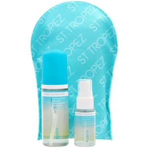 “I love a natural, sunkissed glow and St. Tropez has always been my trusted go-to for their incredible formulas.” - Ashley Graham Discover St. Tropez’s Purity Mini Kit for a flawless, natural-looking glow from head to toe in just a single application - included are the Self Tan Purity Bronzing Water, Purity Face Mist and Applicator Mitt. New tropical scent No need to rinse, no transfer Easy to apply with a light sheen to guide application 100% clean, vegan-friendly & naturally derived tanning active Ingredients Mini Purity Mousse: Aqua (Water), Dihydroxyacetone, Glycerin, Butylene Glycol, Decyl Glucoside, Ethoxydiglycol, Phenoxyethanol, Saccharide Isomerate, Citrus Nobilis (Mandarin Orange) Fruit Extract, Sodium Metabisulfite, Potassium Sorbate, Citric Acid, Parfum (Fragrance), Linalool, Limonene, Hexyl Cinnamal, Citronellol, Hibiscus Sabdariffa Flower Extract, Sodium Citrate. Mini Purity Face Mist: Aqua (Water), Dihydroxyacetone, PEG-40 Hydrogenated Castor Oil, Phenoxyethanol, Benzyl Alcohol, Glycerin, Saccharide Isomerate, Citrus Nobilis (Mandarin Orange) Fruit Extract, Sodium Metabisulfite, Parfum (Fragrance), Panthenol, Hydrolyzed Hyaluronic Acid, Linalool, Butylene Glycol, Limonene, Hexyl Cinnamal, Citronellol, Hibiscus Sabdariffa Flower Extract, Citric Acid, Sodium Citrate, Potassium Sorbate.