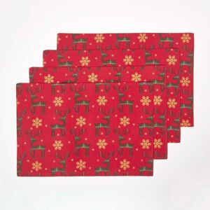Brand Homescapes Size Available 30cm x 45cm (12″ x 18″) Colour Red Material 100% Cotton Care Instructions Machine washable at 40°C Pack Includes 4 placemats Colourful red Christmas placemats with vibrant reindeer design, these set of 4 placemats will add a splash of colour to your dinner table at Christmas time. Red Placemats A vibrant set of 4 red placemats woven from 100% cotton. Thick and durable, they feature a festive reindeer design and are perfect for adding a colourful touch to your Christmas table. Measuring 45 x 30 cm, these large placemats are ideal for protecting the table from hot plates and accidental spills. Christmas Placemats The perfect Christmas colour combination, these traditional style placemats feature green tartan reindeers surrounded by gold snowflakes and sat against a Christmas red background. Part of Homescapes' exclusive Red Reindeer collection, matching napkins, tablecloths and kitchen accessories are also available. To care for your placemats machine