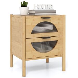 Discover the perfect blend of style and functionality with this stunning bamboo nightstand! Elevate your bedroom with its rustic charm and sleek modern touches, featuring natural bamboo, chic reeded glass, and an elegant metal handle. Say goodbye to clutter with 2 spacious drawers and a spacious tabletop, perfect for keeping all your essentials organized and close at hand. Crafted from sustainable, high-strength bamboo, this piece isn’t just beautiful—it’s built to last. Plus, its raised legs include protective pads to keep your floors pristine. Versatile and stylish, it effortlessly transitions from a chic bedside table to a trendy end table or a savvy office storage solution. Upgrade your space with this exquisite, multi-functional showpiece today! Rustic Meets Modern Design: This bamboo nightstand features an exquisite blend of natural bamboo grain, reeded tempered glass fronts, and a sleek metal handle. This striking combination blends into any design theme, elevating your
