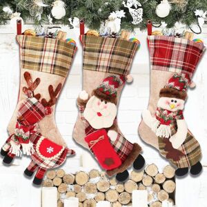 【Set of 3】The package includes 3 large Christmas stockings with Santa, snowman, reindeer or elves pattern. Each Christmas stocking has a 8.1cm lanyard for easy hanging. (The iron ring is not included). 【Large Stockings】The height after hanging is about 50cm. The width of the stocking opening is 20-23cm/7.8-9". These Christmas stockings have a spacious interior and will not limit Santa's generosity. Perfect for all kinds of candies, small gifts, and other Christmas stocking fillers. 【Amazing 3D Design】The three-dimensional images of Santa Claus, snowman, reindeer, and elves make these Christmas stockings more delicate and beautiful. Combining classic Christmas colors such as red, green, and plaid, your luxurious Christmas stockings will surprise children and guests! 【High-quality Material】Our Christmas stocking is made of high-quality burlap, fluff, non-woven fleece fabric, which provides a soft and comfortable touch. Multi-layer design with PP cotton inside makes them super thick and