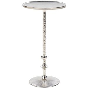 Modern End Table. Your framed photos, potted plant or a fruit bowl will look fantastic when placed on this stylish end table. Presenting ornamental base and glossy silver finish, it will certainly turn the eyes of your guests. The piece comes handy when styled next to your sofa, but you can use it as well in a hallway or a bedroom as a spot for all kind of knick-knacks. Combining traditional look with modern form, it adds plenty of character to any interior. Details: Product Type: Side Table Style: Modern General Color: Silver Material Type: Metal Main Material: Aluminium Legs material: Metal Top Material: Metal Shape: Round Finish: E-Coating Storage: No Dimensions: Width: 32 cm Length: 32 cm Height: 61 cm Weight: 3 kg Weight Capacity: 12 kg Offer Includes: 1 x Side Table Key Features: Trendy Design and Colour, Makes Your Interior Stylish, Modern Look and Quality for Many Years, High Quality, Unique Handmade Piece, Exceptionally Easy Care Assembly Information: Partial Assembly