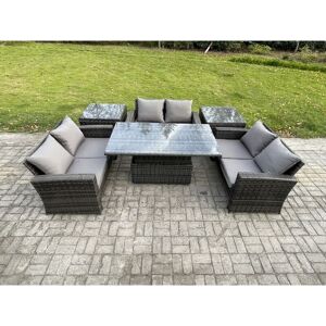 This outdoor garden furniture sofa set has plenty of space for 6 people to sit, with tempered glass coffee table to hold food, drinks and more, a perfect addition to your patio, garden, backyard, pool and other indoor and outdoor spaces. Set Dimensions: • 2 x Side coffee table size:65L x 65W x 66H cm • 1 x PC Rising dining table: 140L x 80W x 68/48H cm (height up 68, down 48) • 3 x 2 Seater sofas size: 124L x 70W x 74H CM Dark grey mixed rattan with dark grey fabric .Color may some difference due to light or monitor .we are unable to return the item due to color problem. Table Can Be Used Both For Coffee Or Dining Table,Cheap Price Compared With Other On Or Offline Store For Rising Table Set Items Comes Flat Packed And Easy Assemble,Sturdy Galvanized Steel Tube Metal Frames With Powder Coating To Prevent The Rust Flat PE Rattan Completely Made By Hand, 5mm Thickness transparent Tempered Glass With Sucker On Surface To Prevent Sliding Low Maintenance ,Removable Cushion Cover And Easy