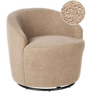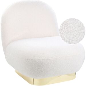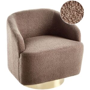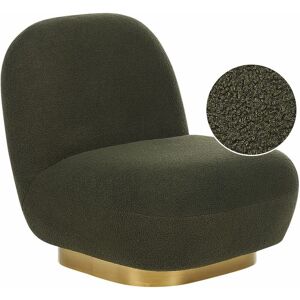 Armchair Upholstered in Bouclé Fabric. This modern armchair delights with its design. It features a round shape and square, golden base that make the chair a unique, geometric piece of furniture. It is upholstered in bouclé fabric, a soft yet strong material that will easily withstand years of usage without losing on its texture and colour. The golden, square base complements the whole design, adding a glam accent and providing stability to the construction at the same time. Combine this armchair with other geometric furniture and accessories in light tones to create a contemporary interior. Details: Product Type: Armchair Style: Glam General Color: Green, Gold Shade: Dark Green Material Type: Fabric Main Material: Boucle Additional Material: Iron Filling Material: Foam Legs material: Metal Seat Material: Fabric Material Composition: 100% Polyester Arm Style: Armless Armrests: No Leg Caps/ Pads: Yes Pattern: Solid Reclining: No Seat Construction: Elastic Belt Seat Foam Density: 28