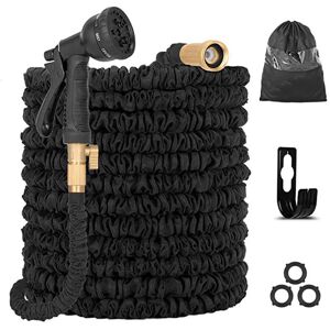 Space Saving & Ultralight: The expandable garden hose can expand up to 3 times (30m) of its original length when full. The pipe easily returns to its original shape. It is easy to use. No knots or twists. Very flexible. Very convenient to carry and store. Durable materials: The expandable garden hose is made of high quality material to prevent bursting and leaking. The safe and reliable material guarantees the durability of the pipe. Note: Hose compatible with 3/4" and 1/2" outdoor faucet. Multi-function sprinkler gun: 8-mode gun: Angle spray, flat spray, full spray, shower, concentrated spray in the center, runoff, cone jet, mist. You can use the gun for gardening, watering the lawn and flowers, cleaning the house, washing the car, washing the dog, etc. Easy to use: just connect the end of the hose to the water tap, then turn on the water. The garden hose expands up to 3 times when filled with water. Simply empty the water from the hose when not in use, put it in the bag and store
