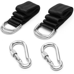 EXTRA SAFE & DURABLE: The highly versatile design of these heavy duty swing straps allows you to use them with a wide variety of swings and hammocks, including spinners, tires, canvases, and backyard swings. Includes two 5-foot heavy duty straps that easily attach to your swing, canvas swing, or lounger with 2 included. Straps are 5 feet long and 2 inches wide. DURABLE MATERIALS: The two-pack of 5-foot straps are made of commercial grade nylon. These straps are able to withstand harsh winters and brutal summers without showing any signs of wear while the carabiner is made of industrial strength steel, making it nearly indestructible. STRONG & SAFE: Due to the high-strength nylon we use in our swing sets, each strap can hold up to 1400 pounds (total 2800 pounds). High-quality stainless steel rings and carabiner, you can have confidence knowing that your Swing Tie will never rust, fade, or be affected by unpredictable weather conditions. Easily hang any swing in minutes without damaging