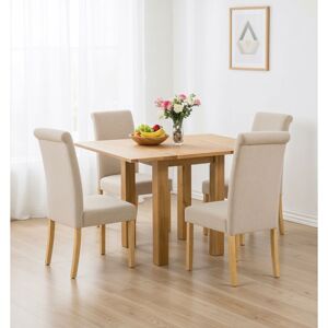 If you are looking for a small dining table set in natural oak finish, look no further. This classic table and cross back chair set is simply the perfect choice. The 120cm by 70cm table is best suited for a large kitchen or a small dining room. It is finished with a protective layer of hard and tough lacquer which means the table top won't mark easily. The table top is made of MDF with real oak veneer which gives the top a real and beautiful characteristics of natural oak grains. The four matching chairs are also finished with the same protective layer of lacquer. There are four choices of the seat pad ranging from light colour to dark colour. The chair itself is made of solid oak which means it is very sturdy and durable. The classic ladder back design gives a comfortable support to the back of the body. Dimensions are: Table - H 75 x W 120 x D 70cm, Chair - H 91 x W 43 x D 46cm Features Table with 4 chairs Oak and real oak veneer Sturdy and durable Assembly: Legs need assembly