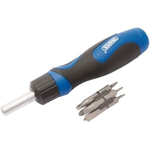 Description This is a ratchet screwdriver with a forward, reverse, and lock mechanism for easy and efficient screw driving. It features bits stored conveniently inside the handle, allowing quick access during use. The set includes 13 pieces, making it versatile for various tasks. It is supplied in a countertop display and is part of the Draper product range. Technical Specifications Includes 13 pieces Ratcheting mechanism with forward, reverse, and lock functions Bits stored inside the handle for convenience Compatibility and Accessories Compatible with standard screwdriver bits Bits are stored inside the handle for easy access Installation No installation required; ready to use out of the box Usage Use the ratchet mechanism to tighten or loosen screws efficiently Switch between forward, reverse, and lock modes as needed Replace bits as necessary for different screw types