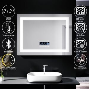 The LED mirror was designed in modern style,with stylish aluminium frame frosted edge,which was more fashionable and energy saving than the ordinary mirror,It not only illuminated your beautiful face clearly,but also added artistic sense to your bathroom,The high-quality structure meets the safety standard of IP44,which is safer to use,It is the first choice for you to use at home,Besides,our mirror is equipped with the manual,which is easy to install. Features: Mirror Size: 600 x 800 x 35 mm 4mm thinness copper free mercury mirror Powerful Backlighting Great quality aluminium Frame Beautiful frosted edge 15mm Adjustable light,Time and date Mist removing function Double bluetooth speakers for better sound quality Modern design shaver socket Adjustable Brightness Bluetooth Shaver Socket