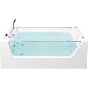 White Oval Hydro Massage Bathtub. A beautiful free-standing bathtub that will add an elegant touch to your bathroom. The minimalistic oval shape and LED lighting will make it a complementary piece for modern decors. It's equipped with a hydro massage system of eight AirJet nozzles for relaxing soak and soothing massage. The overflow and water inlet with chrome finish is situated in the middle so it is not in the way. The whole construction is reinforced with fibreglass for durability and non-porous acrylic for easy cleaning. Details: Product Type: Indoor Hot Tub Style: Modern General Color: White, Silver Material Type: Acrylic Main Material: Acrylic Additional Material: Steel Shape: Oval Airjets: 8 Digital Control Panel: Yes Finish: Galvanized Hydro Massage Jets: Yes Power consumption: 300 W Noise Level: 50-85 Voltage rating: 230 V (50 Hz) Underwater Light: Yes Capacity: 220 Waterfall: No Dimensions: Width: 80 cm Inner Dimensions: 113x47x43 Length: 170 cm Height: 59 cm Weight: 54 kg