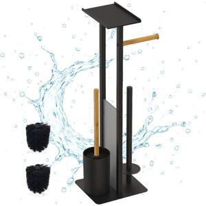 With this elegant toilet stand, you always have toilet paper, spare rolls, and the toilet brush within easy reach. Additionally, the practical shelf provides space for your smartphone, wet wipes, and more. Whether in the bathroom or guest WC, the freestanding toilet stand can be flexibly positioned and does not need to be fixed to the wall. The replaceable brush head and removable plastic brush container ensure necessary hygiene. Toilet set in detail - Dimensions H x W x D: approx. 65 x 21 x 18 cm - Shelf W x D: approx. 18 x 12 cm - Roll holder H x D: approx. 31.5 x 2 cm - Brush head H x D: approx. 10 x 8.5 cm - Brush container H x D: approx. 14.5 x 9.5 cm - Weight: approx. 1.5 kg - Material: iron, bamboo, plastic - Various colours available Standing toilet roll holder with toilet brush - Practical combination of toilet roll and brush holder - Hygienic, replaceable brush head - Includes 2 replacement heads - Removable toilet brush holder for easy cleaning - The spare roll holder
