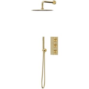 Model Number: WDB77589 Transform your showering experience with our extraordinary Colore Brushed Brass Triple Thermostatic Valve Mixer Shower Including 300mm Round Fixed Shower Head with Ceiling Arm and Round Shower Outlet Holder with Kit. Designed to suit any modernly styled bathroom or ensuite, this showering package features a high-end, roundfixed shower head hung from the ceiling and controlled by a beautifully concealed thermostatic shower valve. The set is also complete with a practical wall-mounted shower handset and hose for the times when you wish to wash yourself without getting your hair wet. Made from high-grade stainless steel and finished with a stunning brushed brass coating, this shower set denotes elegance and class and will be a lovely finishing touch to your bathroom. Key features Round concealed valve Wall-mounted shower hose and handset Durable stainless steel construction Large luxury 300mm round drencher head Modern brushed brass finish Thermostatic controls for