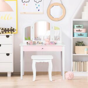 Transform your beauty routine with this stylish and functional vanity set! This vanity desk features an LED lighted mirror with 3 color dimmable lighting options to suit various needs, whether applying makeup, styling hair, or an everyday look. The matching stool with soft sponge cushion allows for comfortable seating. Plus, the vanity table offers practical storage solutions with 2 pull-out drawers and an acrylic makeup organizer, making it easier to find your cosmetics and accessories without clutter. Designed with your safety in mind, the makeup table includes an anti-toppling device to securely anchor it in place. Moreover, the golden metal legs offer strong support while adding a touch of elegance to any bedroom decor. Costway Vanity Set Makeup Dressing Table w/ Soft Cushioned Stool & Mirror in Brown