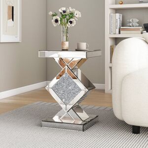 Give your living room, bedroom, entryway, or patio an instant upgrade with this gorgeous mirrored glass end table. This silver side table crafted from sturdy MDF panels and mirrored glass features a glam diamond-shaped design with a mirrored top surface, reflects light around your room, and adds space to your home. The front of the square modern small end table is inlaid with beautiful crystals making it funky and unique. Plus, the glass corner table arrives fully assembled, so you can start using it right away in your contemporary, minimalist, or luxury home. Blue Elephant