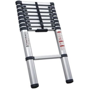 Sealey: Aluminium Telescopic Ladder 9-Tread EN 131 Extends and locks rung-by-rung allowing use at multiple heights. Innovative air dampened function ensures user safety while ladder is lowered. Closed height of 720mm for easy storage and transportation make this ideal for surveyors, tradesmen and domestic use. Lightweight, corrosion resistant aluminium frame. Rubber feet offer increased stability while in use. Manufactured to EN 131 with 150kg capacity. MPN: ATL09 EAN: 5051747669765 Aluminium Telescopic Ladder 9-Tread EN 131 Attributes: MFR Part No.: ATL09