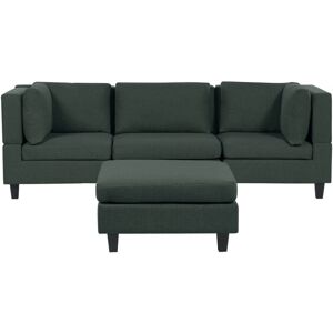 Upholstered Modular Sofa. This upholstered, modular couch is going to transform your living room into a lounging zone. The set consists of multiple modules, which you can connect together, to achieve a classic, straight couch, or use them as standalone furniture that offers extra seating space. All pieces are covered with high-quality, soft polyester fabric, that resembles linen with its look, so it will surely turn the heads of all your houseguests. The construction is also very stable thanks to synthetic legs, and thick padding guarantees comfort during use. Details: Product Type: 3 Seater Sofa Style: Modern General Color: Green, Black Shade: Dark Green Material Type: Fabric Main Material: Fabric Additional Material: Eucalyptus Wood Filling Material: Foam Material Composition: 100% Polyester Shape: Rectangular Arm Style: Track Fabric Upholstered Back: Yes Leg Caps/ Pads: No Pattern: Solid Seat Construction: Sinuous Springs Seat Foam Density: 30 kg/m3 Seats Up To: 3 People