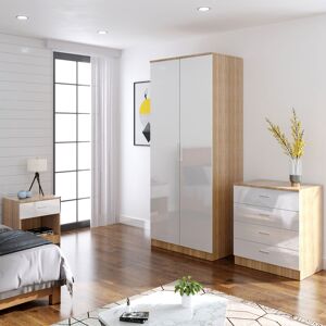 Modern Wardrobe and Cabinet Furniture Set Bedroom 2 Doors Wardrobe and 4 Drawer Chest and Bedside Cabinet, White/Oak - Elegant