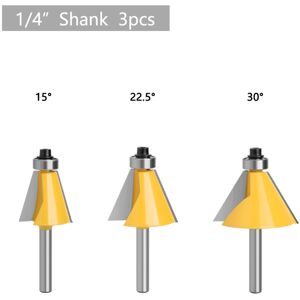 3PCS: Industrial grade chamfer drill bit set with 15°, 22.5° and 30° chamfer angle, designed for countersinking and creating miter joints at various angles. Processing: Baked-in heat-resistant coating prevents the build-up of sawdust, resin and step. High Efficiency: High hook and shear angles allow the cutters to run smoothly in producing clean, splinter-free material. Cut Precise Dice and Grooves: For shelving and cabinet projects and endless applications of simple straight cutting. Application tools Perfect woodworking tools for cutting all composition materials, MDF, wood, hardwood and softwood