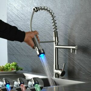 LED Indicator: The LED lights up when the faucet is turned on. Three colors change with water temperature: red, green and blue, with a red flash indicating that the water is too hot. Powered by a generator, it works without batteries. Reliable quality: 35mm ceramic filter element, prevents water leakage, saves water and is more durable. With quiet filtering device, it can effectively filter dirt and reduce water flow noise. Application: 7-shape kitchen faucet with swivel spout, the 360 swivel spout ° gives your kitchen great freedom of movement for hot and cold water, perfect for kitchen sinks with 1 or 2 basins. Environmental protection material: brass body, resistance pressure resistance, high temperature resistance, wear resistance, anti-aging, chrome surface. The material is pollution-free, environmentally friendly and has a long service life. EASY TO ASSEMBLE: This kitchen sink faucet is easy to install and comes with two hoses, one blue and a red one, to provide universal