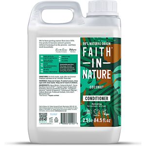 Faith in Nature Coconut Conditioner 2.5L is a bulk buy conditioner that offers a more sustainable way of reducing waste in your hair care regime. This conditioner contains organic coconut oil for hair that is brimming with tropical aromas and natural hydration for your hair. This cruelty-free and vegan conditioner is perfect for anyone wanting to be as kind to the planet as they are to their hair. Natural conditioner for hair made with 100% natural fragrance & essential oils 2.5L bulk buy conditioner for normal to dry hair Parabens and sulphate-free 99% natural origin Vegan Society Approved and Cruelty-Free hair care How to use Faith in Nature conditioner: After shampooing, apply Coconut Conditioner to damp hair, working it through to the ends. For best results, leave on your hair for 5 minutes to allow it to soak into the strands, then rinse well with water until hair has no residues which can leave hair flat. Use with Faith in Nature Coconut Shampoo for ultimate hair hydration. In case of contact with eyes, rinse with clean water immediately. If irritation occurs, stop use. Keep out of reach of children Part of the Faith in Nature 2.5L refills range. If you're looking to be even more eco friendly and reduce your plastic waste even further, then this fragrance is also available in a 5L refill bottle, or alternatively you can find it in the form of a plastic-free conditioner bar. Established in 1974, Faith in Nature believe in harnessing the power of nature without harming it in the process. Their products are made using the highest quality, naturally derived vegan and cruelty-free ingredients with 100% natural fragrance - and they work beautifully.