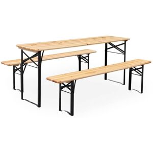 This 6-seater guinguette-style table can be used as a reception, camping or garden table. Ideal for all your events, it comprises a table and 2 benches. Thanks to its hard-wearing materials, it can be set up both indoors and outdoors. The top and table are made from wood with a clear varnish finish. The edges are rounded for added comfort. The frame is epoxy-painted steel. The unit is foldable for easy storage. It has a locking mechanism. Product benefits Ideal for events Brewery spirit User-friendly: 6 people Easy to store Additional information This set is not designed for everyday use and cannot be exposed to the elements. To accompany this garden table at your events, you'll find party tents in our catalogue. Table: 177x49.5x75.5cm Bench: 177x24.5x45.5cm Seat height : 45.5cm