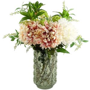 These artificial flower arrangements come with the vases � a complete pack of everything you need to create the display shown in our photos. When arranged as we have it shown in our photos this measures 55cm x 40cm x 40cm. Stems are wired and this can be shaped to your requirements. This pack contains the following: 1 x LEAF-40576 30cm green retro bubble vase 30cm x 18cm x 18cm at widest points. 1 x LEAF-40648 70cm artificial viburnum spray. 2 x LEAF-40654 85cm artificial green foliage spray. 1 x LEAF-40685 75cm extra large silk reflex chrysanthemum - white. 2 x LEAF-40686 75cm extra large silk reflex chrysanthemum - pink. 2 x LEAF-40699 90cm artificial Hainan Elaeocarpus stem with nine flowers. Flowers and foliage are supplied loose at full length ready for you arrange. You can cut these shorter if wanted for arrangement (very easy- just use wire cutters) or you can just fold the stems at the ends before putting them in the vase Leaf