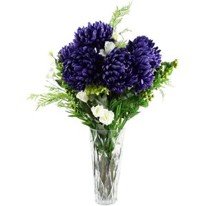 These artificial flower arrangements come with the vases � a complete pack of everything you need to create the display shown in our photos. When arranged as we have it shown in our photos this measures 90cm x 55cm x 55cm. Stems are wired and this can be shaped to your requirements. This pack contains the following: 1 x LEAF-40592 35cm clear chunky ridged glass vase 35cm x 17cm x 17cm at widest points. The top rim measures 15cm. 2 x LEAF-40649 70cm artificial green berry spray. 2 x LEAF-40665 80cm artificial white wild silk rose stem with six flowers. 6 x LEAF-40688 75cm extra large silk reflex chrysanthemum - purple. 2 x LEAF-40697 85cm bamboo fern stem. 2 x LEAF-40698 120cm artificial Boston fern stem. 1 x LEAF-40648 70cm artificial viburnum spray. Flowers and foliage are supplied loose at full length ready for you arrange. You can cut these shorter if wanted for arrangement (very easy- just use wire cutters) or you can just fold the stems at the ends before putting them in the vase Leaf