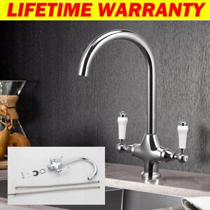 ?Specification: Tap Type: Kitchen tap Main body material: Brass Finish: Chrome Valve: Ceramic valve Control Type: Double Lever Water Feature: Hot and Cold Spout Swivel: 360 degree Design Type: Traditional/Modern Hoses: 2 x flexible hoses Mounting Type: Deck mounted Minimum pressure: 0.5bar Recommended pressure: 1bar ?Features: Dual control lever mono-bloc kitchen mixer tap 360 degrees Swivel spout makes it perfect for big twin double bowl sinks Solid brass construction, making them durable and long lasting Ceramic cartridge assures a lifetime drip free performance and allows exact control of water flow and temperature Twin Ceramic Handle: easy control of hot and cold water Hot & cold mixer mono tap ?Contents: 1 x Kitchen Mixer Tap 2 x connection hoses All fitting hardware